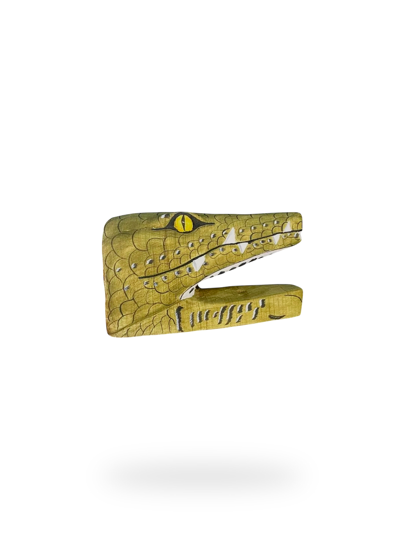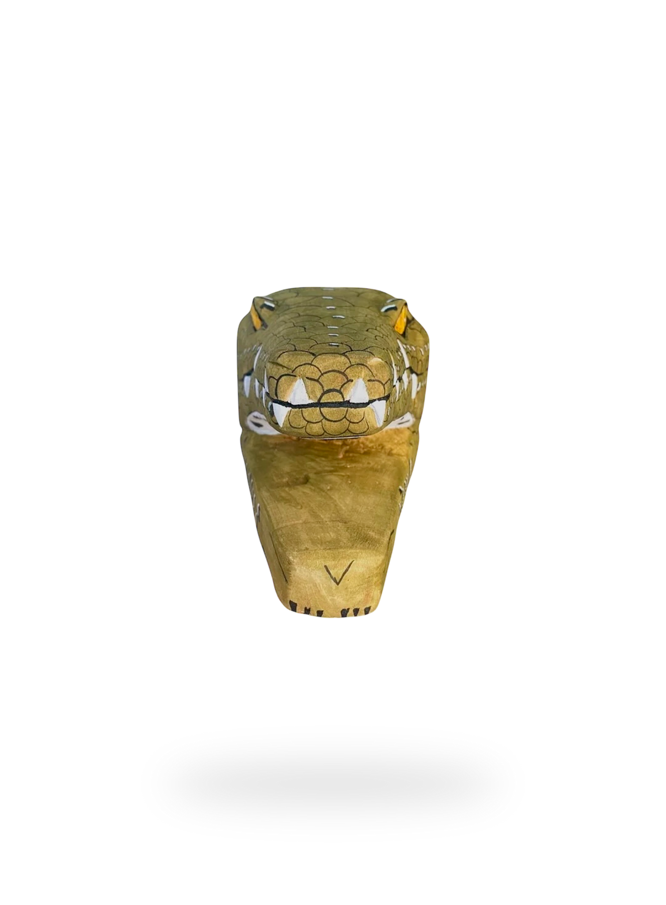 These decorative wooden sculptures rest flat on their paws and/or claws and can be used as bookends or hung on the wall as a decorative mask. It is hand-carved and hand-painted using traditional techniques by skilled artisans from the Chané indigenous group in Salta, Argentina.