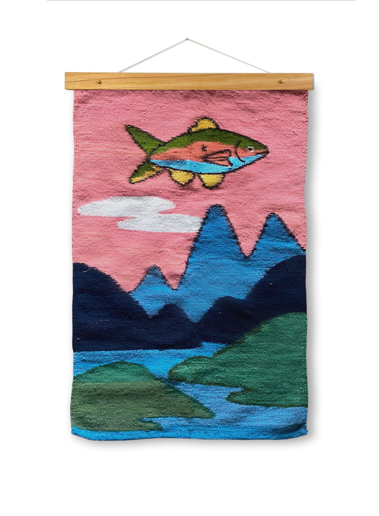 The Trout in the Sky Tapestry is inspired by the stunning Seven Lakes trail in Patagonia, Argentina. Our imaginary countryside is layered with beautiful mountains speckled by shimmering lakes, and of course, an aerial trout. Because, why not?