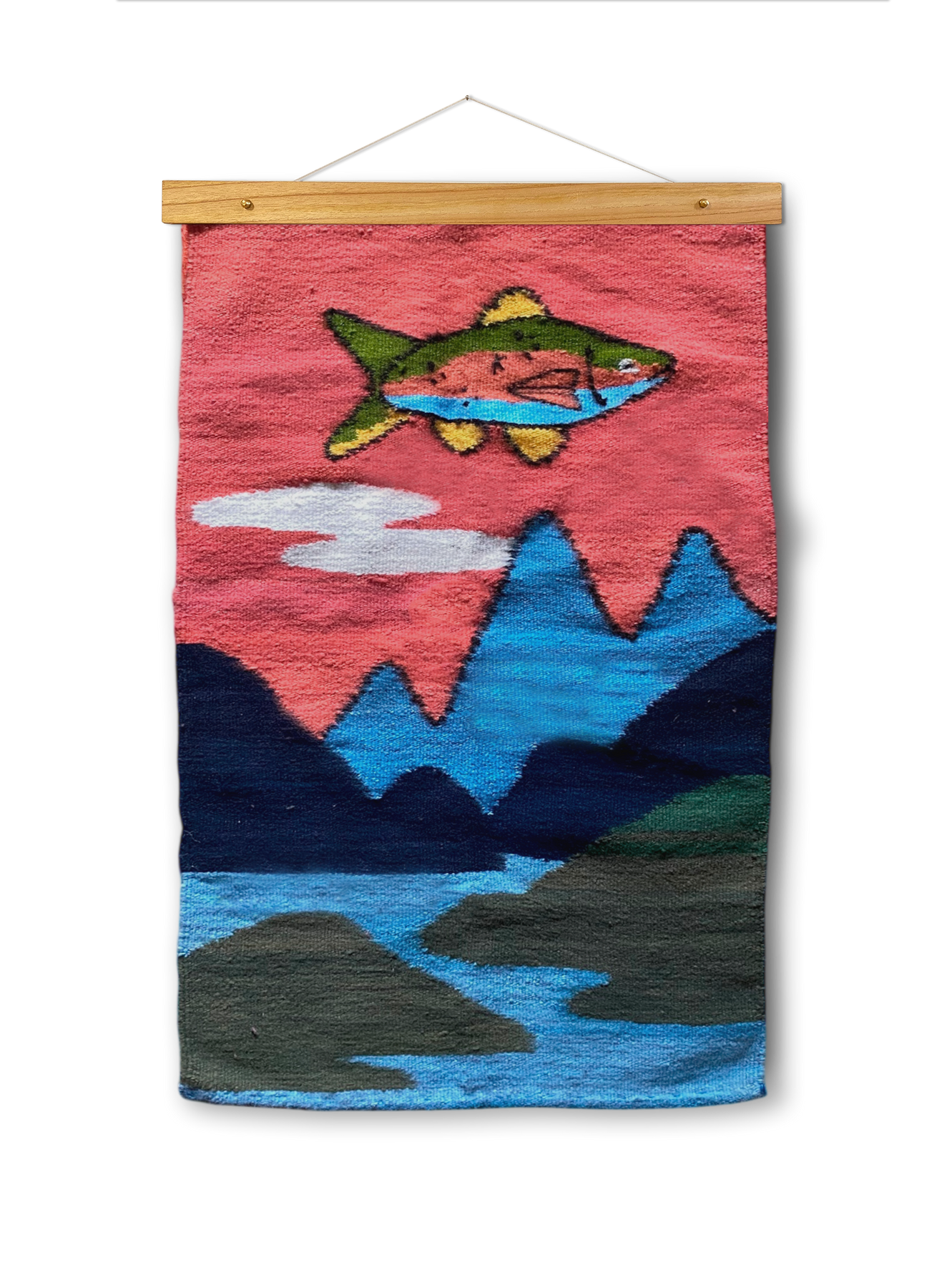 The Trout in the Sky Tapestry is inspired by the stunning Seven Lakes trail in Patagonia, Argentina. Our imaginary countryside is layered with beautiful mountains speckled by shimmering lakes, and of course, an aerial trout. Because, why not?