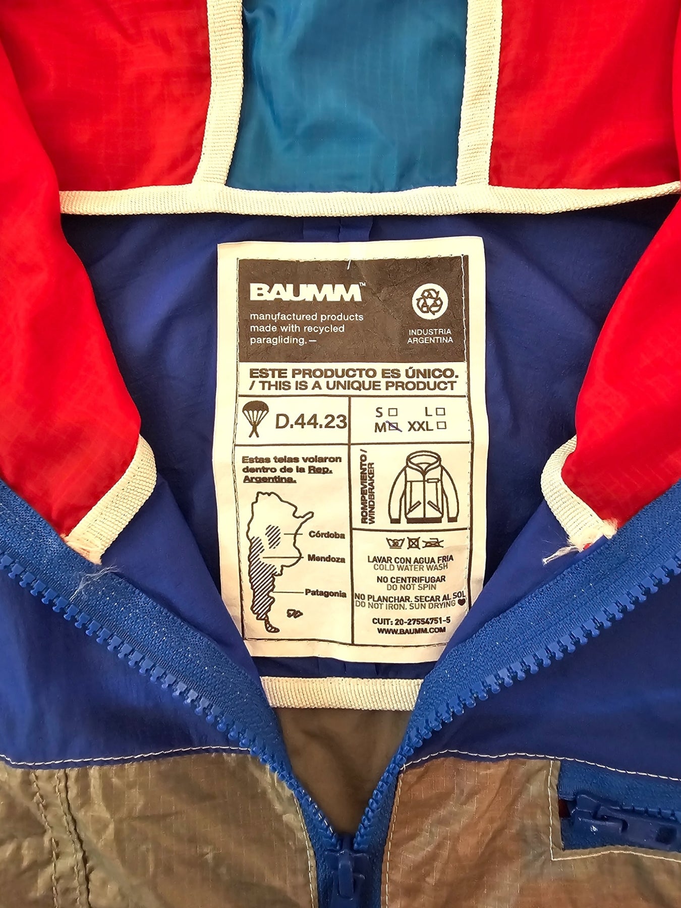 This is a parachute jacket – literally. The Buenos Aires-based Baumm makes colorful windbreakers from a patchwork of over 24 pieces cut from discarded parachutes that have maxed out their flight hours. It is lightweight, windproof, water resistant, super sustainable, one-of-a-kind, and downright awesome.