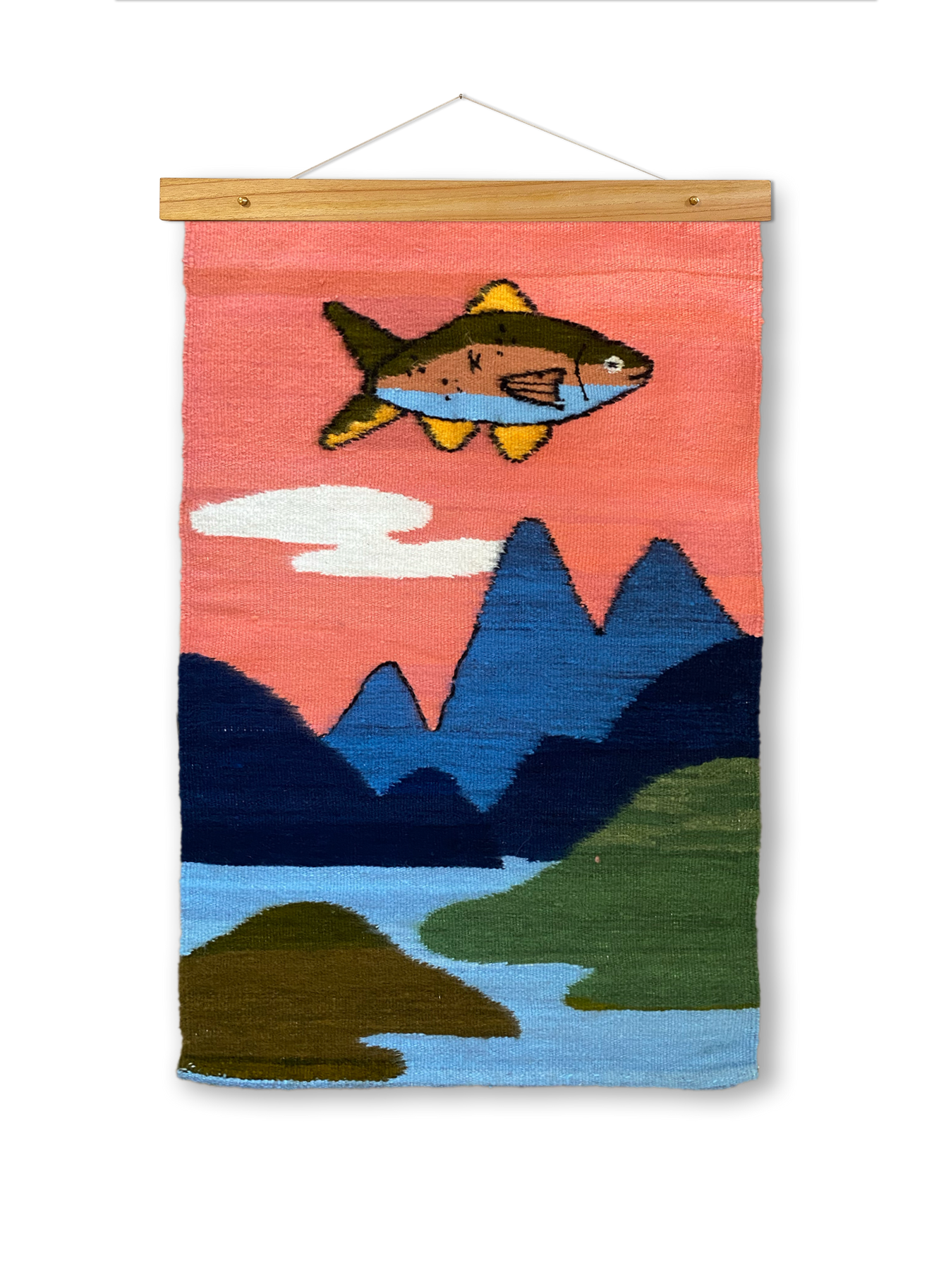 The Trout in the Sky Tapestry is inspired by the stunning Seven Lakes trail in Patagonia, Argentina. Our imaginary countryside is layered with beautiful mountains speckled by shimmering lakes, and of course, an aerial trout. Because, why not?