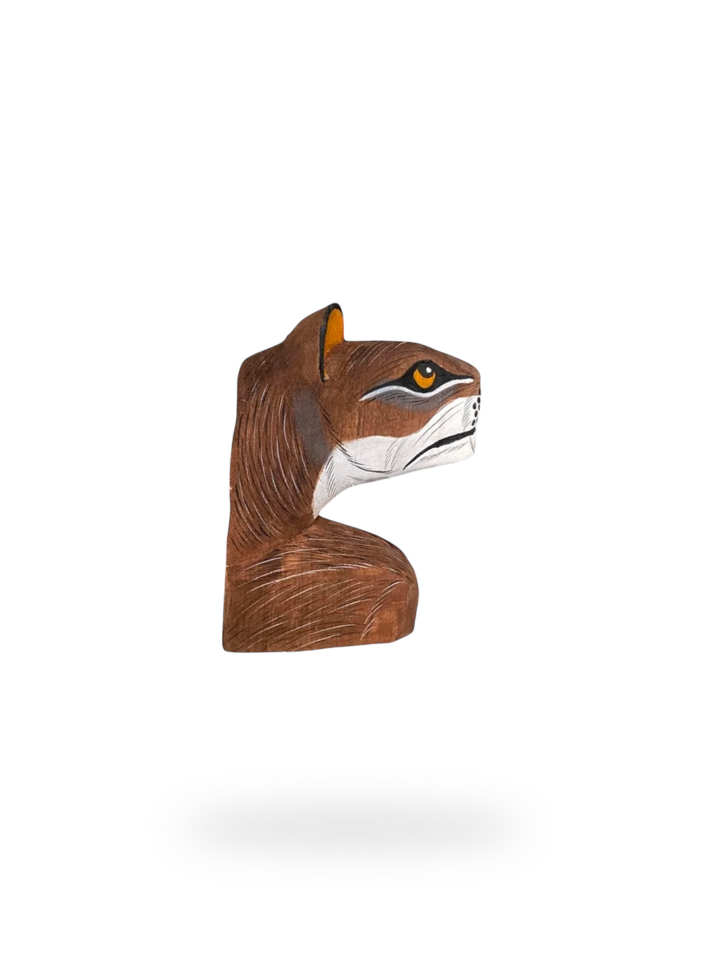 These decorative wooden sculptures rest flat on their paws and/or claws and can be used as bookends or hung on the wall as a decorative mask. It is hand-carved and hand-painted using traditional techniques by skilled artisans from the Chané indigenous group in Salta, Argentina.