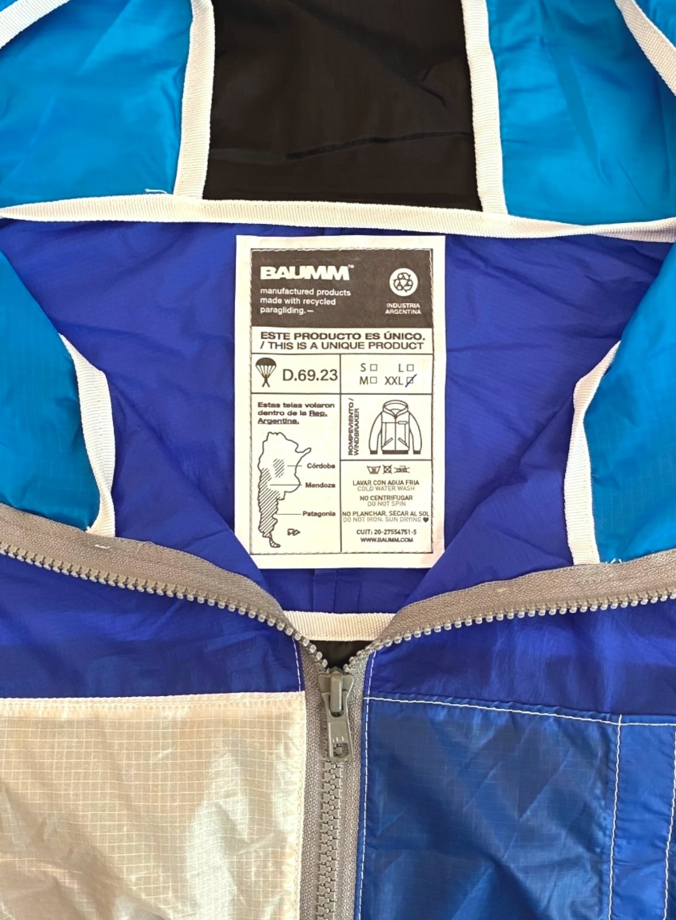 This is a parachute jacket – literally. The Buenos Aires-based Baumm makes colorful windbreakers from a patchwork of over 24 pieces cut from discarded parachutes that have maxed out their flight hours. It is lightweight, windproof, water resistant, super sustainable, one-of-a-kind, and downright awesome.
