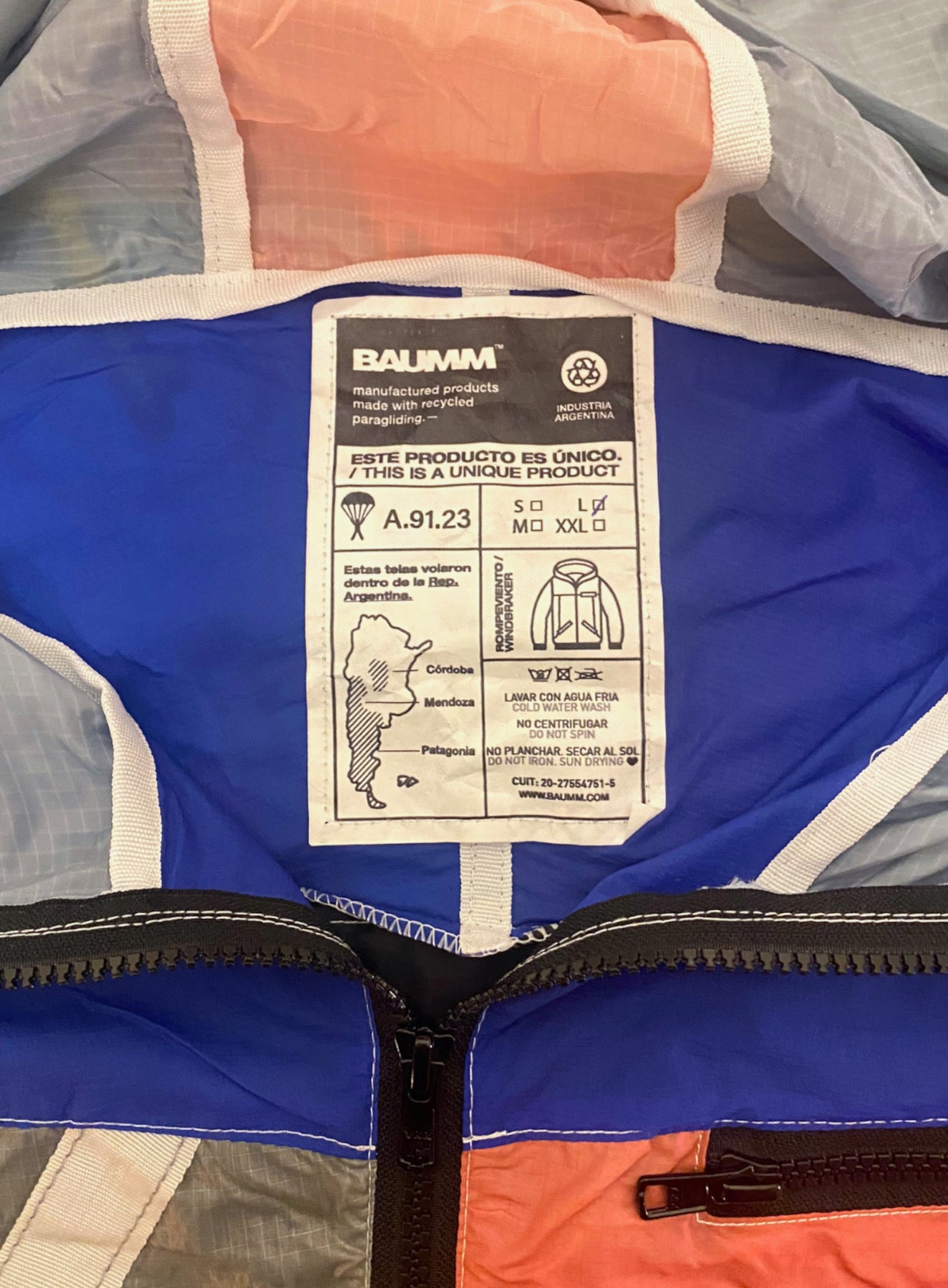 This is a parachute jacket – literally. The Buenos Aires-based Baumm makes colorful windbreakers from a patchwork of over 24 pieces cut from discarded parachutes that have maxed out their flight hours. It is lightweight, windproof, water resistant, super sustainable, one-of-a-kind, and downright awesome.